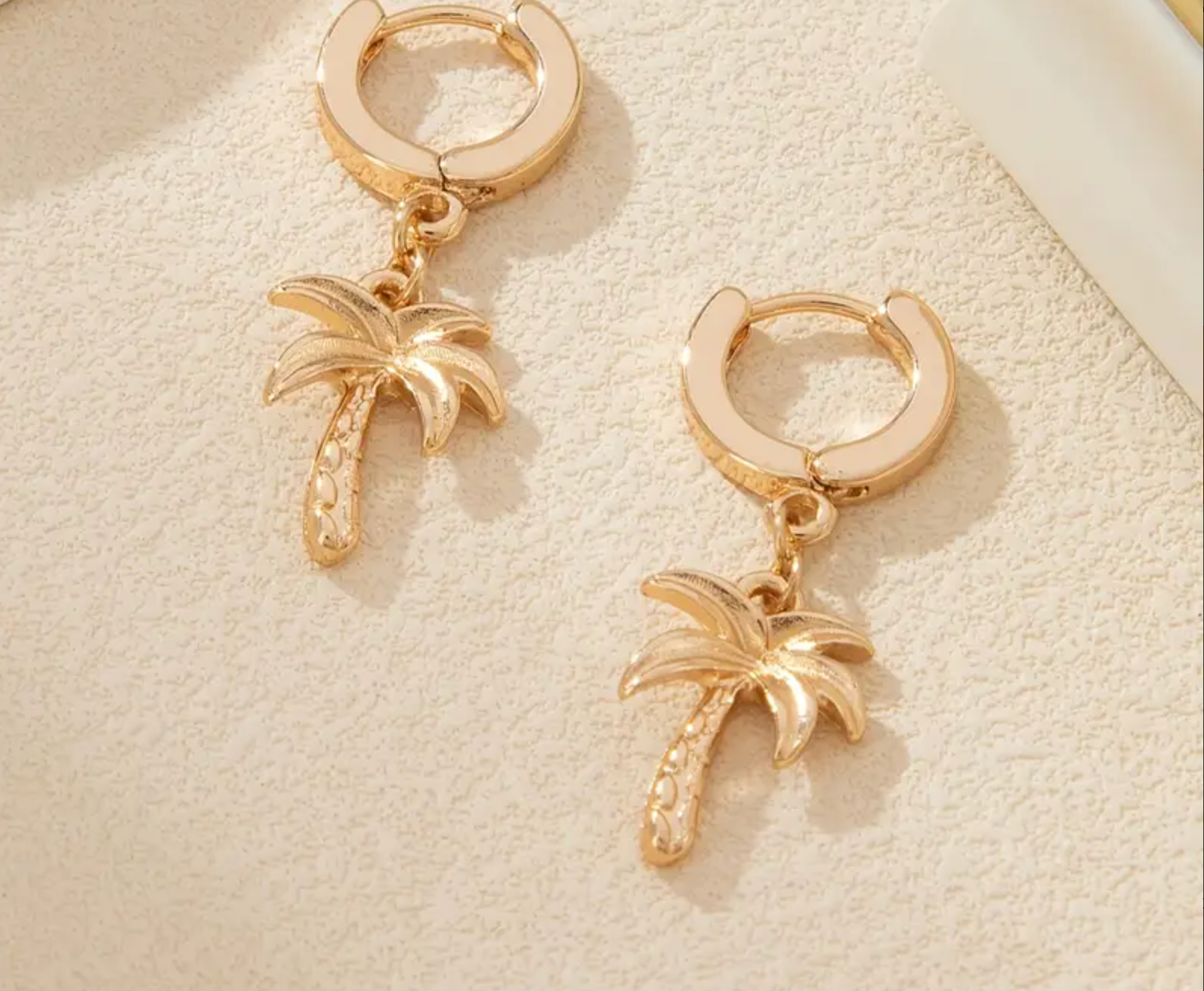 Déjate llevar por la vibra tropical con estos encantadores aros dorados con dije de palmera. Perfectos para darle un toque veraniego y relajado a cualquier look, ¡como un pedacito de playa que llevas contigo! ☀️💛