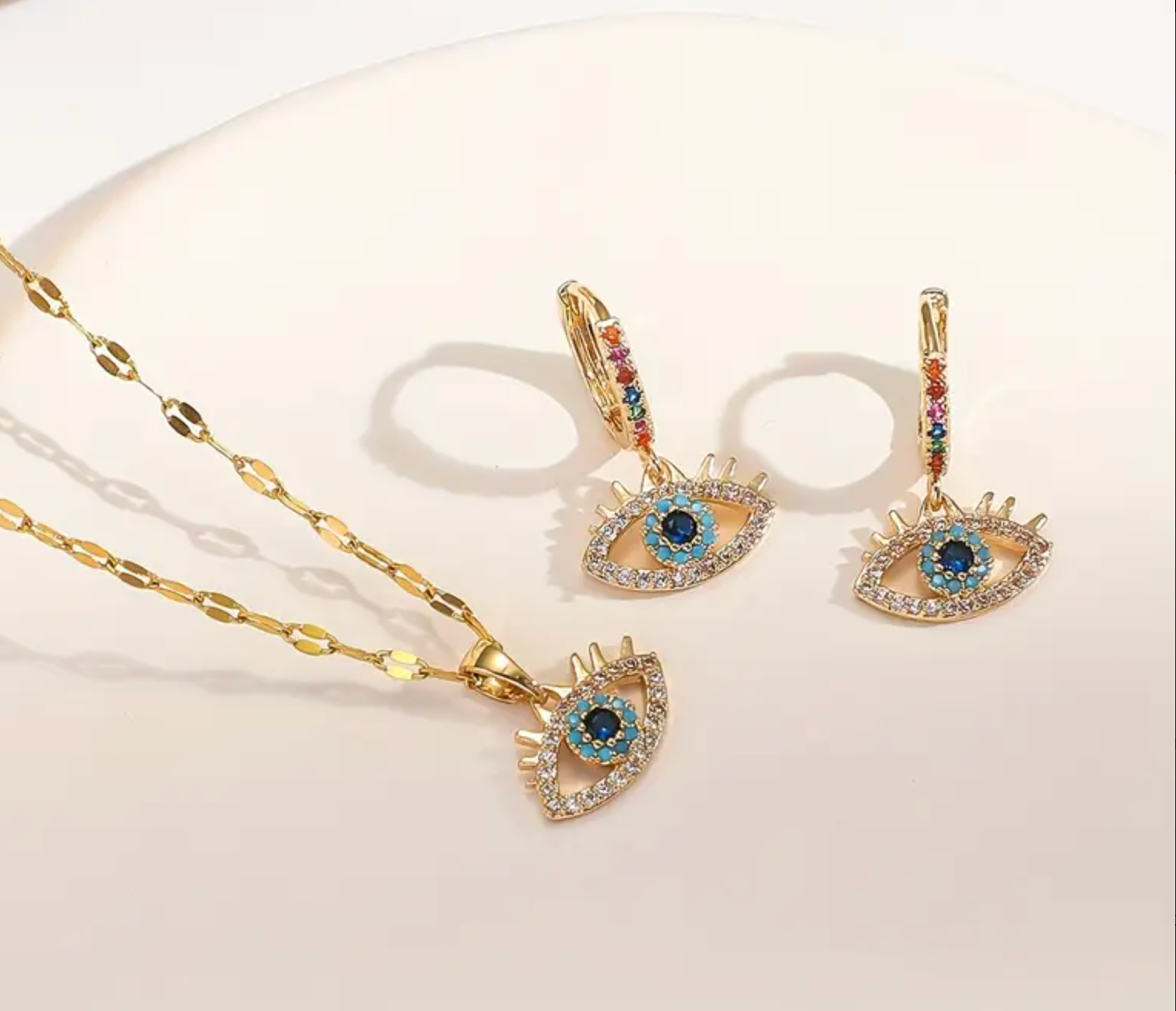 Brilla con estilo y buena energía con este set de collar y aretes en forma de ojo turco 💙✨. Detalles en cristales multicolor que reflejan luz y protección en cada movimiento. Perfecto para quienes aman los accesorios con significado y un toque de glamour 🌟👁️.
