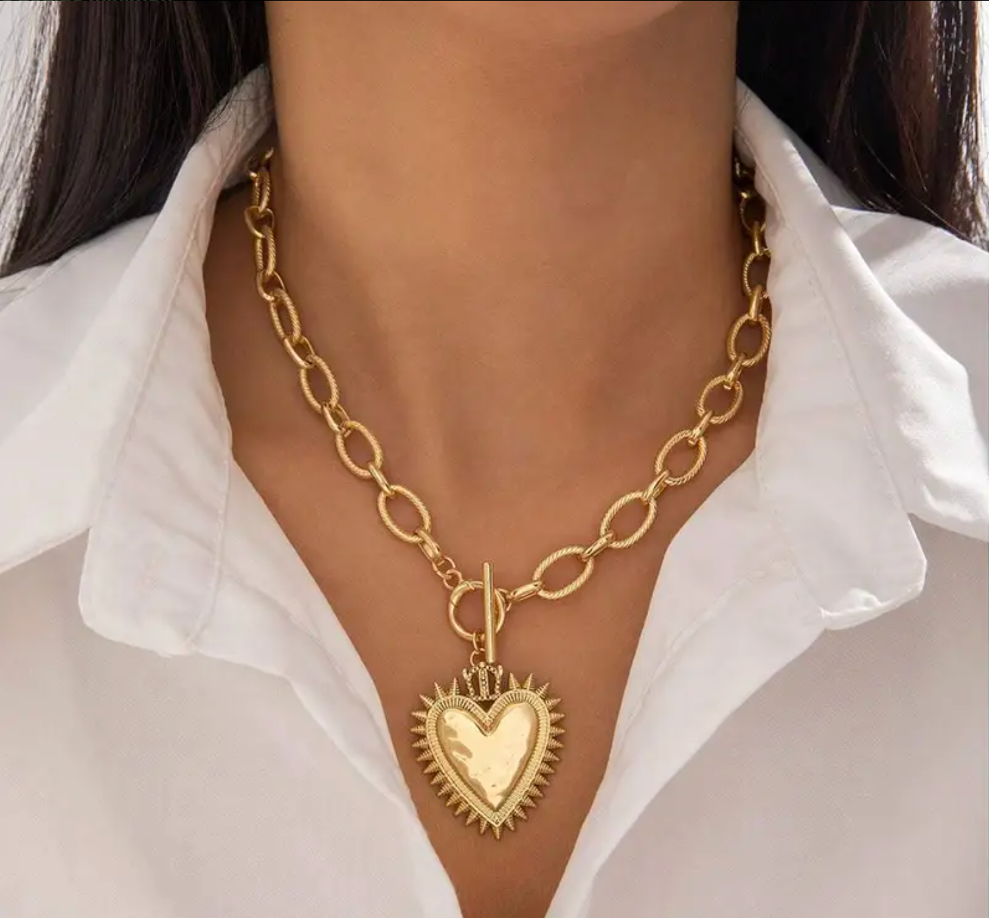 Este collar dorado fusiona la moda audaz con un toque místico gracias a su diseño de cadena gruesa y eslabones ovalados acompañada de un llamativo dije de corazón texturizado. Eleva tus outfits con este collar maxi bold y combínalo con todos tus looks ✨
