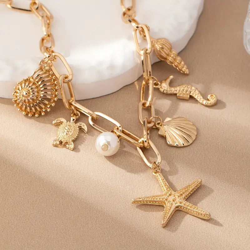 Luce la magia del océano con este encantador collar dorado de eslabones gruesos, adornado con dijes marinos: estrella de mar, caballito de mar, conchas, tortuga y una delicada perla 🐢⭐🐚. Un accesorio vibrante y elegante que aporta frescura y un aire tropical a todos tus looks.